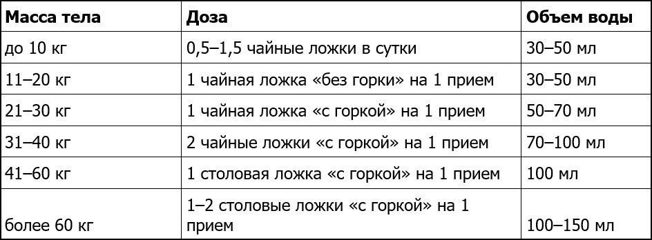 Дозу рассчитывают в зависимости от массы тела: Примечание: 1 чайная ложка «с горкой» – 1 г препарата; 1 столовая ложка «с горкой» – 2,5–3 г препарата. Препарат принимают в 3–4 приема в течение суток.